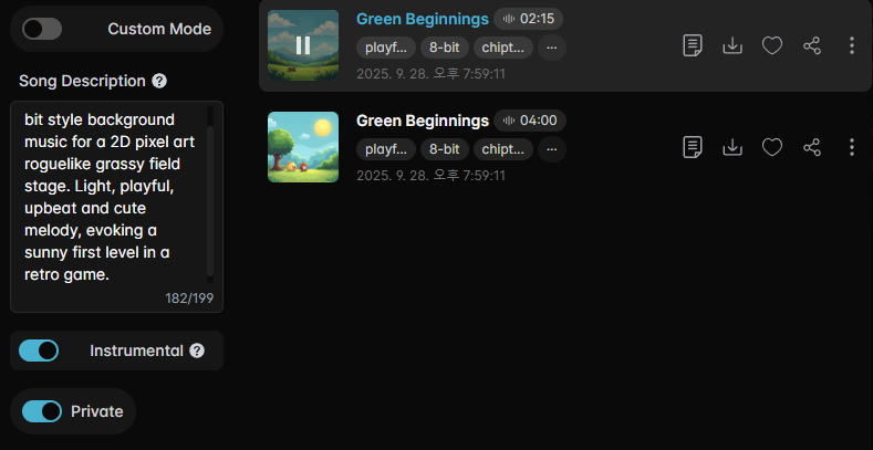 - 루프 재생, SpatialBlend=0(2D), pitch=1.0.