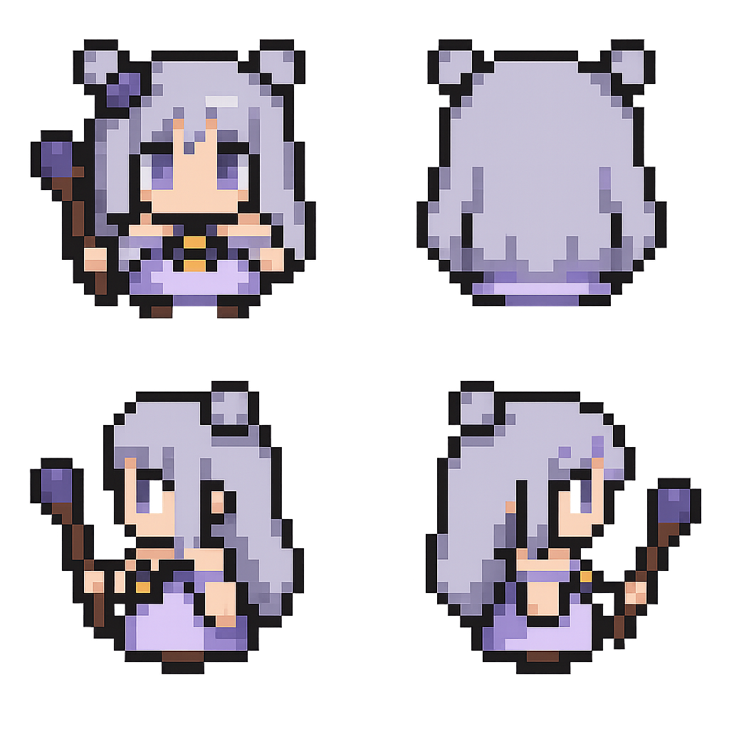 - 걷는 모습, 숨쉬는 모습 (몸이 들썩거리는 듯한 모습) 애니메이션을 만들기 위한 배리에이션 그림을 제작해야 하는데, 그정도까지 일관성을 지켜서 16장의 그림을 그려내는 것은 어려워 보임... 그리하여 전후좌우만 뽑고 나머지는 직접 도트를 찍어서 그리기로 결정...